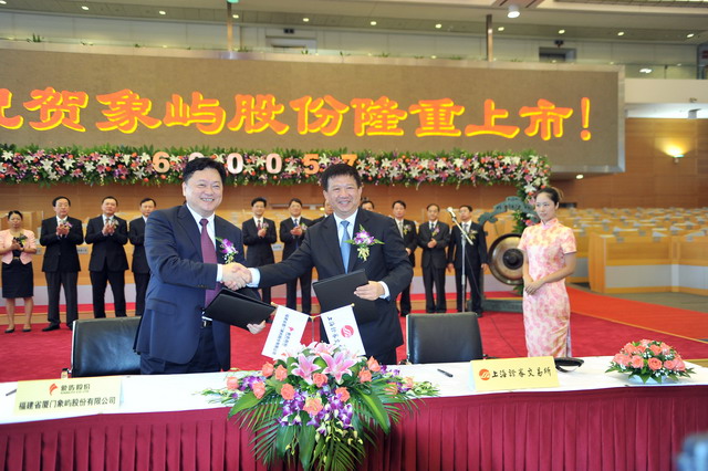 2011年8月29日,福建省廈門(mén)象嶼股份有限公司在上海證券交易所舉行隆重的重組上市儀式。廈門(mén)市人民政府葉重耕副市長(zhǎng)及象嶼股份王龍雛董事長(zhǎng)共同敲鑼開(kāi)盤(pán)。象嶼股份股價(jià)高開(kāi)逾1倍,開(kāi)盤(pán)價(jià)8.25元,早市最高漲127.5%。截至早市收盤(pán),報(bào)8.29元,漲108.29%。